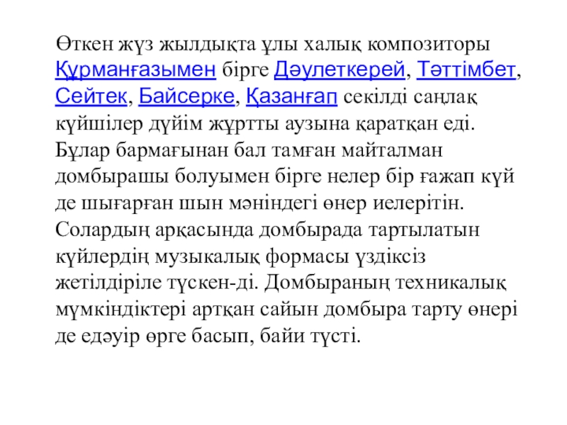 Слайд 7 Өткен жүз жылдықта ұлы халық композиторы Құрманғазымен бірге Дәулеткерей,