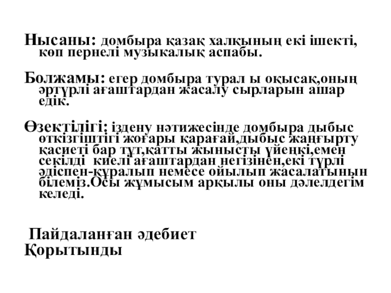 Нысаны: домбыра қазақ халқының екі ішекті,көп пернелі музыкалық аспабы.
