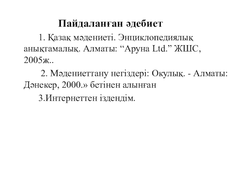 1. Қазақ мәдениеті. Энциклопедиялық анықтамалық. Алматы: “Аруна Ltd.” ЖШС, 2005ж..
