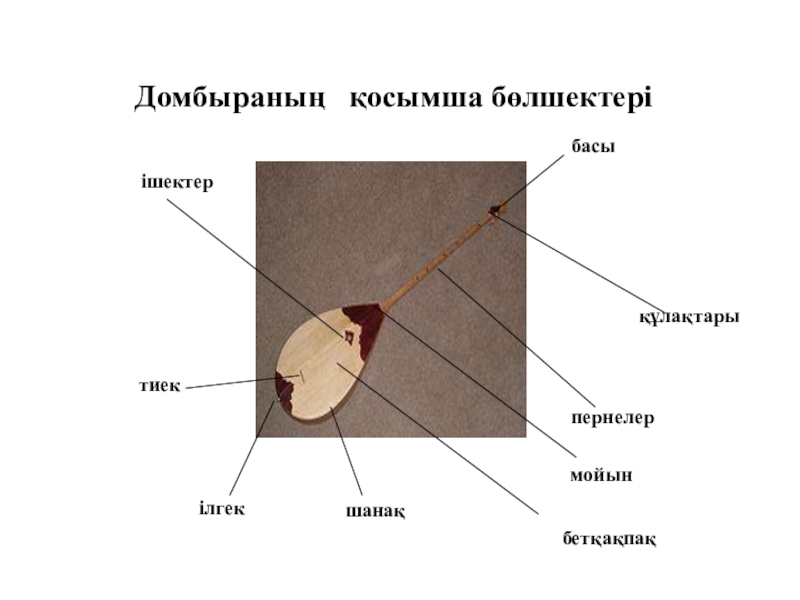 бетқақпақ, ілгек және ішектер. Сондай-ақ, оның көптеген қосымша бөлшектері бар (тиек, кемер ағаш, тұжым ағаш, бастырма, ойық, қалқа, түйме, өрнек, желкелік). Домбыра тиегі үш түрлі болады (шайтан тиек, негізгі тиек, табалдырық тиек).