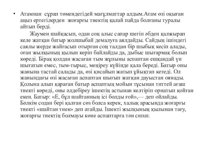 Слайд 8Атамнан сұрап төмендегідей мағұлматтар алдым.Атам өзі оқыған аңыз ертегілерден жоғарғы тиектің