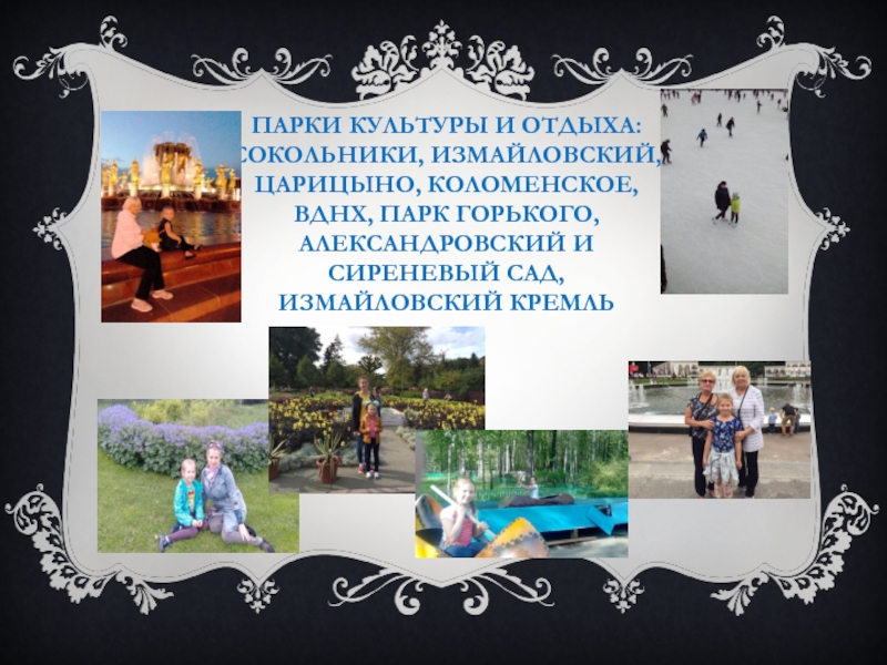 ПАРКИ КУЛЬТУРЫ И ОТДЫХА:СОКОЛЬНИКИ, ИЗМАЙЛОВСКИЙ, ЦАРИЦЫНО, КОЛОМЕНСКОЕ, ВДНХ, ПАРК ГОРЬКОГО, АЛЕКСАНДРОВСКИЙ И СИРЕНЕВЫЙ САД, ИЗМАЙЛОВСКИЙ КРЕМЛЬ