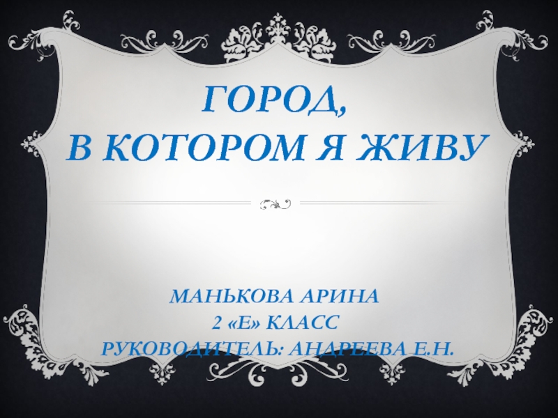 Слайд 1ГОРОД, В КОТОРОМ Я ЖИВУ Манькова Арина 2 «е» класс руководитель: Андреева Е.Н.
