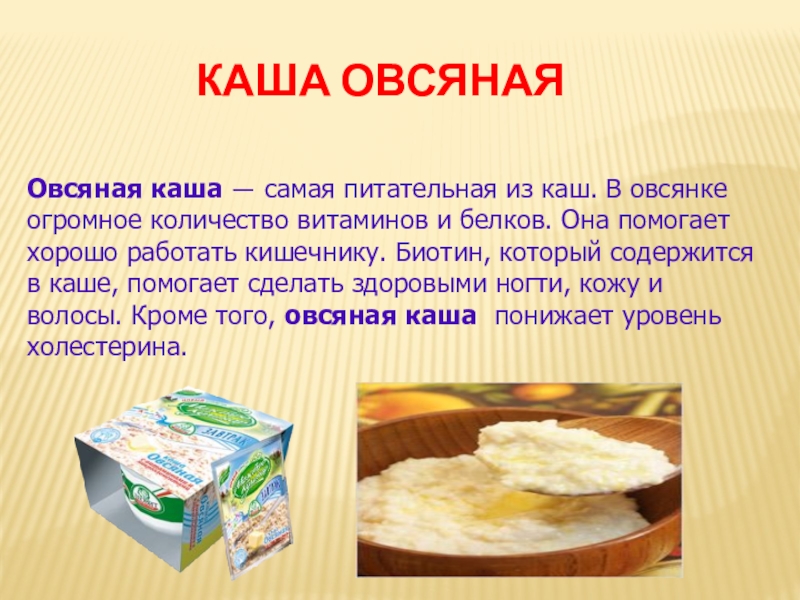 огромное количество витаминов и белков. Она помогает хорошо работать кишечнику. Биотин, который содержится в каше, помогает сделать здоровыми ногти, кожу и волосы. Кроме того, овсяная каша понижает уровень холестерина.