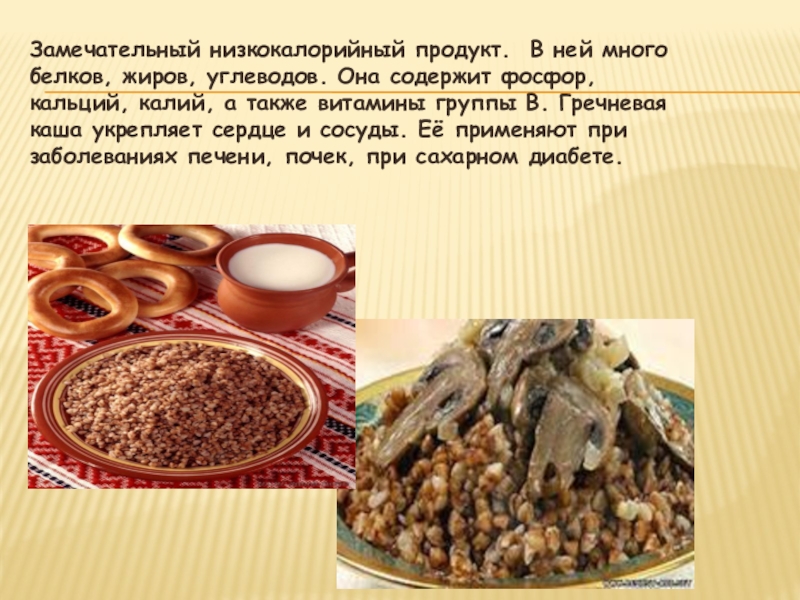 фосфор, кальций, калий, а также витамины группы В. Гречневая каша укрепляет сердце и сосуды. Её применяют при заболеваниях печени, почек, при сахарном диабете.