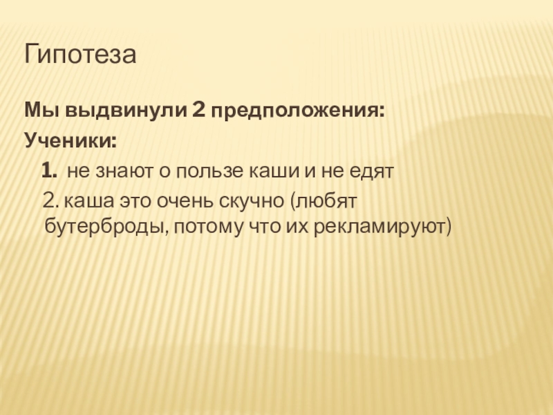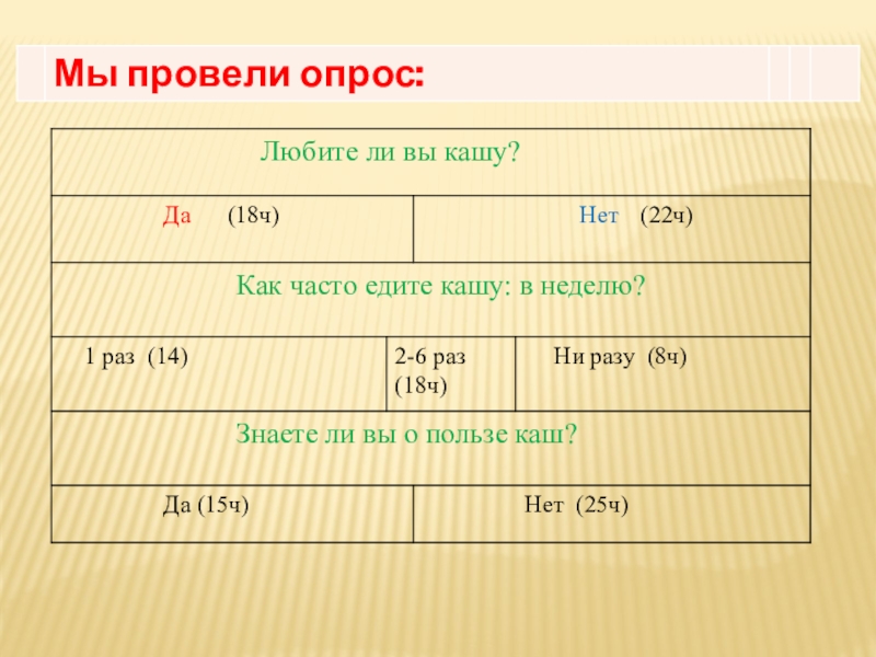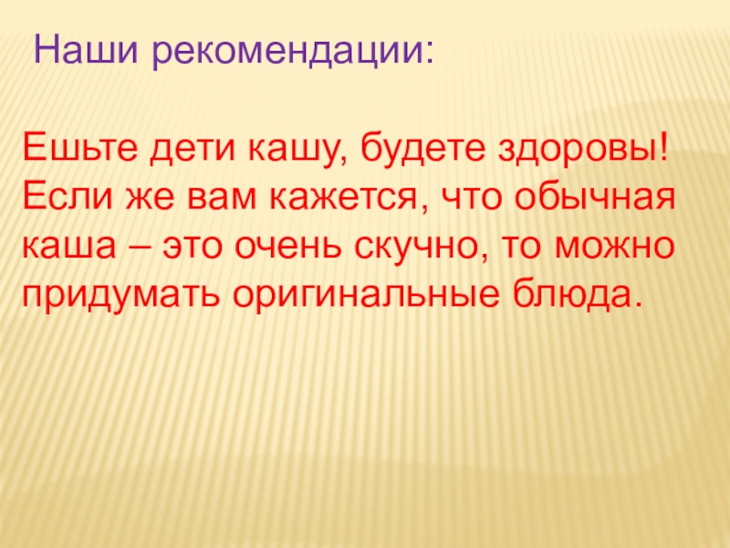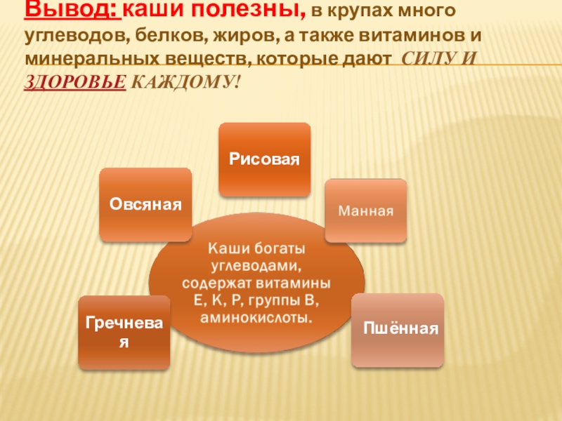 Слайд 21Вывод: каши полезны, в крупах много углеводов, белков, жиров, а также