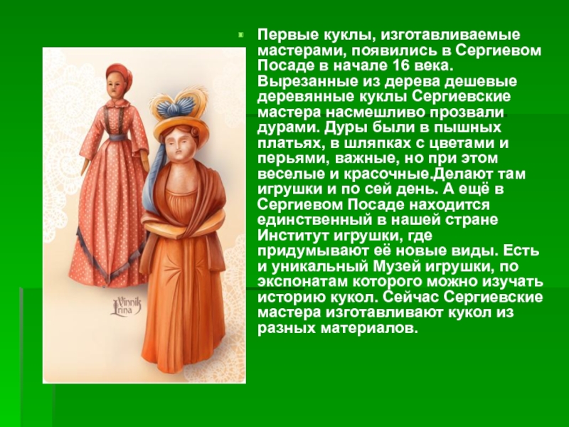 века. Вырезанные из дерева дешевые деревянные куклы Сергиевские мастера насмешливо прозвали дурами. Дуры были в пышных платьях, в шляпках с цветами и перьями, важные, но при этом веселые и красочные.Делают там игрушки и по сей день. А ещё в Сергиевом Посаде находится единственный в нашей стране Институт игрушки, где придумывают её новые виды. Есть и уникальный Музей игрушки, по экспонатам которого можно изучать историю кукол. Сейчас Сергиевские мастера изготавливают кукол из разных материалов.