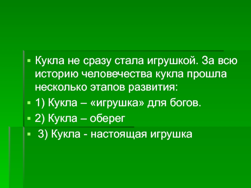 Кукла не сразу стала игрушкой. За всю историю человечества кукла прошла