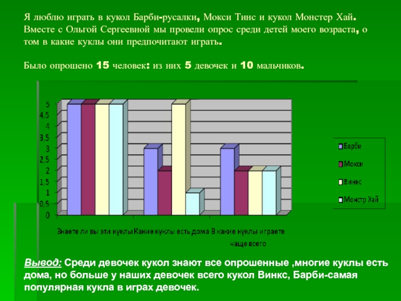 Хай. Вместе с Ольгой Сергеевной мы провели опрос среди детей моего возраста, о том в какие куклы они предпочитают играть.