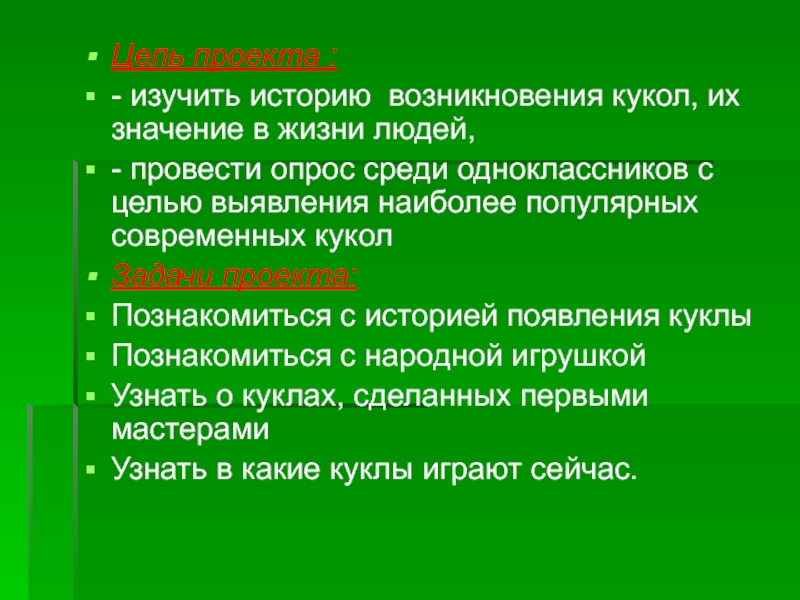 - изучить историю возникновения кукол, их значение в жизни