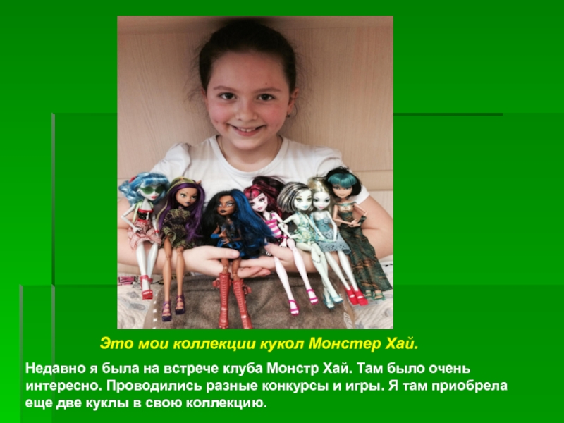 Недавно я была на встрече клуба Монстр Хай. Там было очень интересно. Проводились разные конкурсы и игры. Я там приобрела еще две куклы в свою коллекцию.