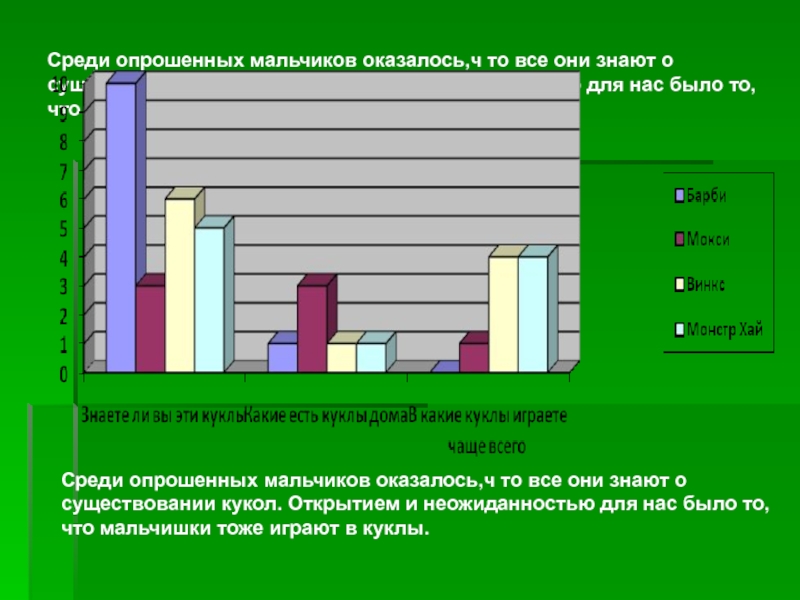Среди опрошенных мальчиков оказалось,ч то все они знают о существовании кукол. Открытием и неожиданностью для нас было то, что мальчишки тоже играют в куклы.