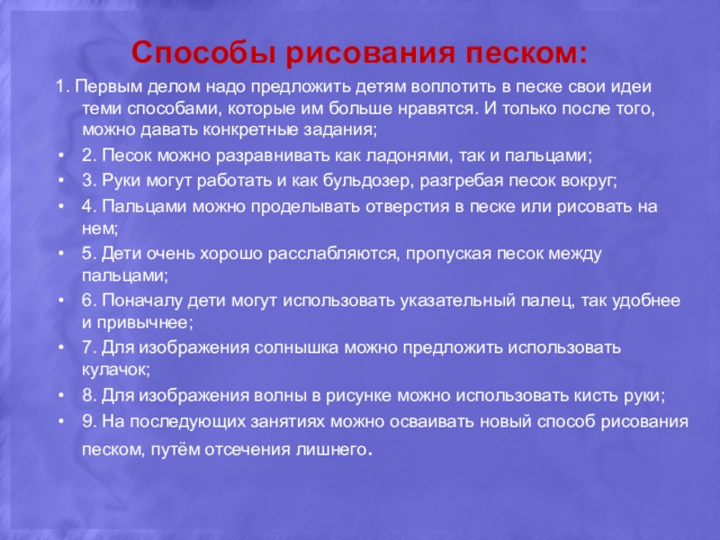 песке свои идеи теми способами, которые им больше нравятся. И только после того, можно давать конкретные задания;