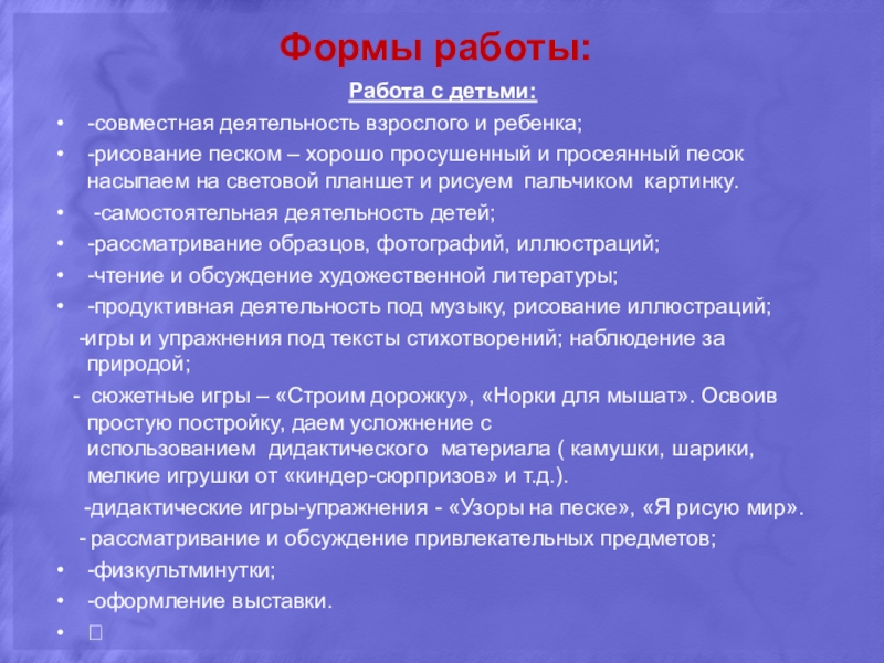 -дидактические игры-упражнения - «Узоры на песке», «Я рисую мир».