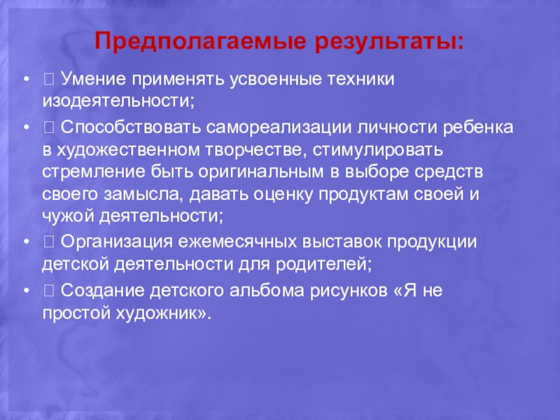 личности ребенка в художественном творчестве, стимулировать стремление быть оригинальным в выборе средств своего замысла, давать оценку продуктам своей и чужой деятельности;