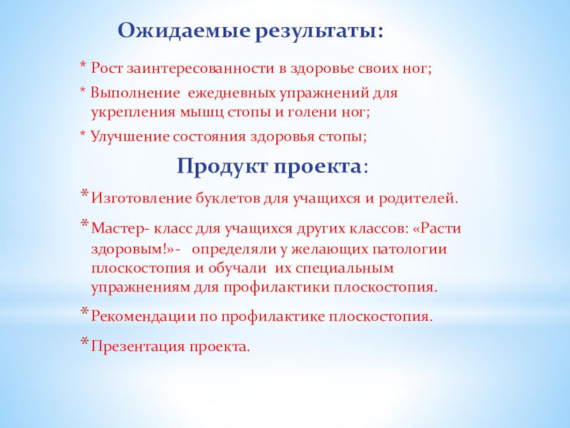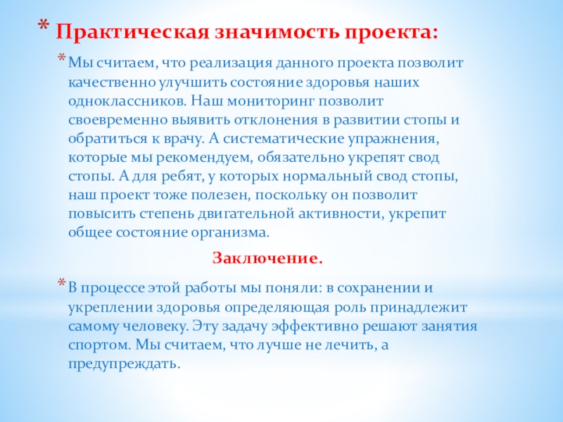 состояние здоровья наших одноклассников. Наш мониторинг позволит своевременно выявить отклонения в развитии стопы и обратиться к врачу. А систематические упражнения, которые мы рекомендуем, обязательно укрепят свод стопы. А для ребят, у которых нормальный свод стопы, наш проект тоже полезен, поскольку он позволит повысить степень двигательной активности, укрепит общее состояние организма.