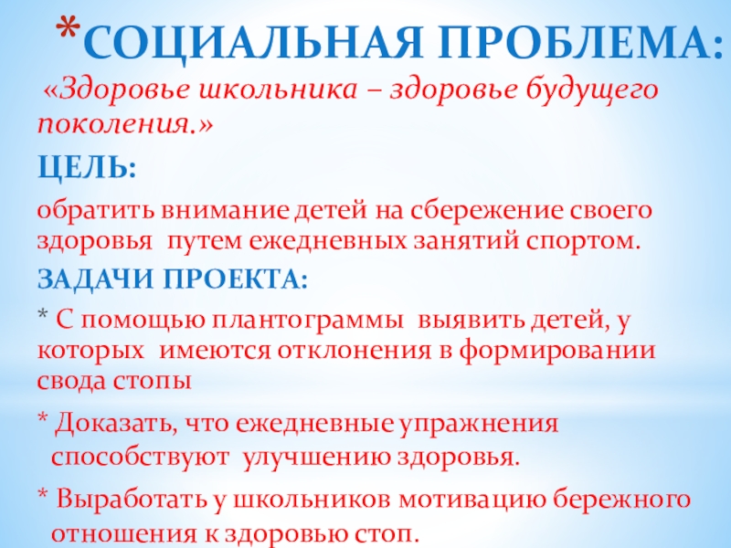 * Выработать у школьников мотивацию бережного отношения к здоровью стоп.