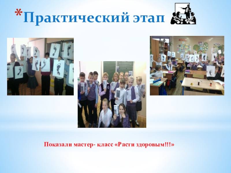 Мастер- класс для учащихся других классов: «Расти здоровым!»- определяли у желающих патологии плоскостопия и обучали их специальным упражнениям для профилактики плоскостопия.