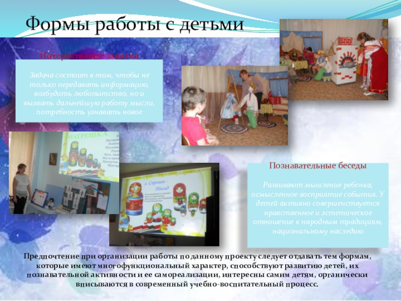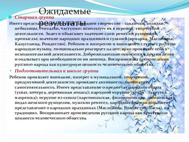 Развивают мышление ребенка, осмысленное восприятие события. У детей активно совершенствуется нравственное и эстетическое отношение к народным традициям, национальному наследию