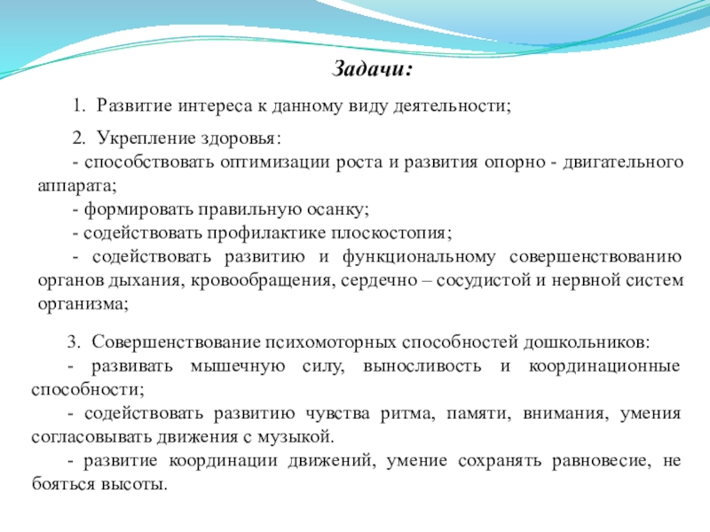- развитие координации движений, умение сохранять равновесие, не бояться высоты.
