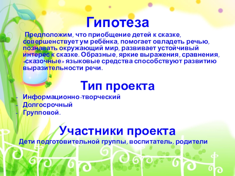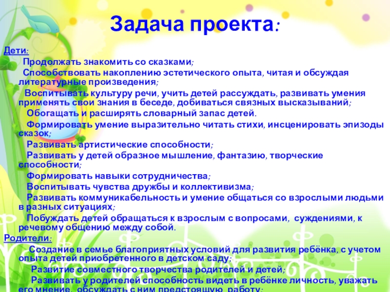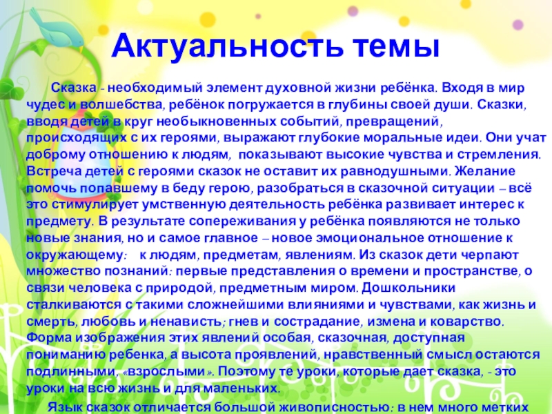 совершенствует ум ребёнка, помогает овладеть речью, познавать окружающий мир, развивает устойчивый интерес к сказке. Образные, яркие выражения, сравнения, «сказочные» языковые средства способствуют развитию выразительности речи.