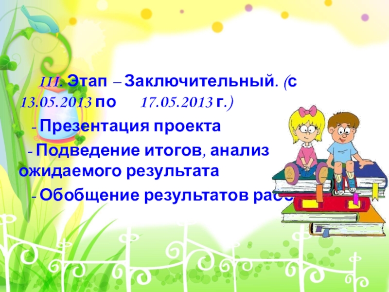 Слайд 18 III. Этап – Заключительный. (с 13.05.2013