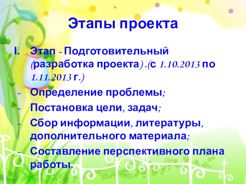 Этап - Подготовительный (разработка проекта) .(с 1.10.2013 по 1.11.2013