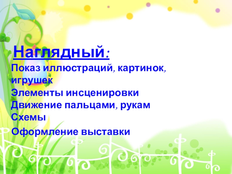 Показ иллюстраций, картинок, игрушек Элементы инсценировки Движение пальцами, рукам Схемы