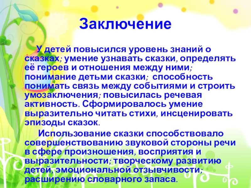 Использование сказки способствовало совершенствованию звуковой стороны речи в сфере произношения, восприятия и выразительности; творческому развитию детей, эмоциональной отзывчивости; расширению словарного запаса.