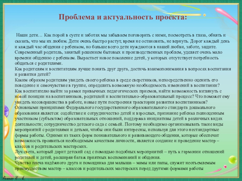и заботах мы забываем поговорить с ними, посмотреть в глаза, обнять и сказать, что мы их любим. Дети очень быстро растут, время не остановить, не вернуть. Дорог каждый день и каждый час общения с ребенком, но больше всего дети нуждаются в нашей любви, заботе, защите. Современный родитель, занятый решением бытовых и производственных проблем, уделяет очень мало времени общению с ребенком. Вырастает новое поколение детей, у которых отсутствует потребность общаться с родителями.