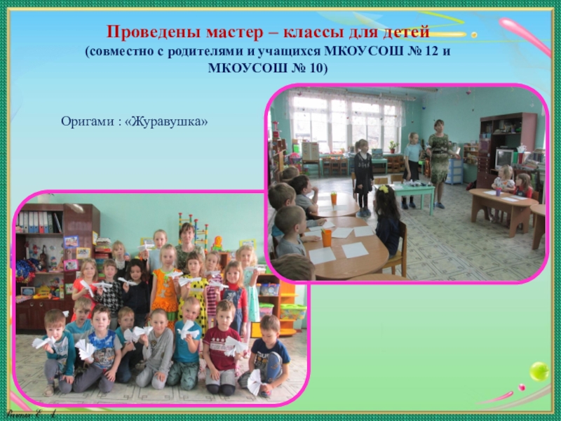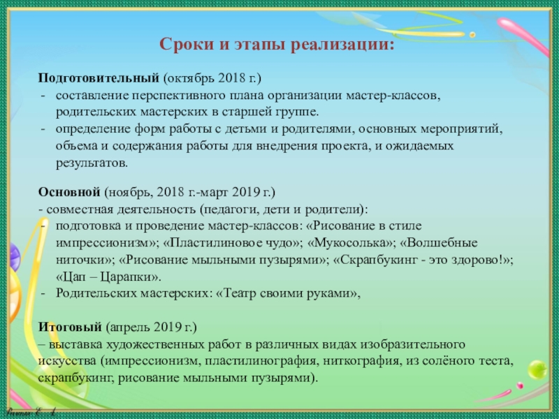 подготовка и проведение мастер-классов: «Рисование в стиле импрессионизм»; «Пластилиновое чудо»; «Мукосолька»; «Волшебные ниточки»; «Рисование мыльными пузырями»; «Скрапбукинг - это здорово!»; «Цап – Царапки».