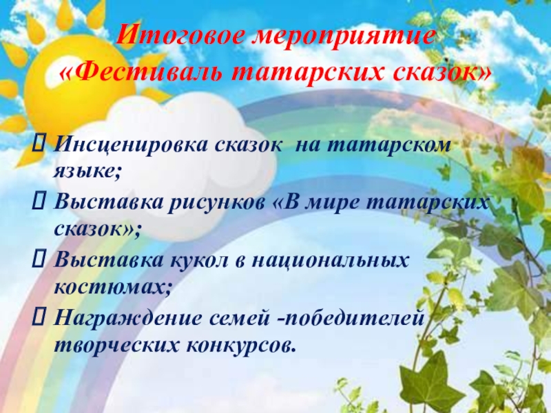 Слайд 28Итоговое мероприятие – фестиваль «Мир татарских сказок»