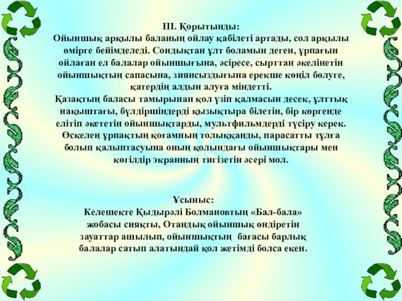 Келешекте Қыдырәлі Болмановтың «Бал-бала» жобасы сияқты, Отандық ойыншық өндіретін зауаттар ашылып, ойыншықтың бағасы барлық балалар сатып алатындай қол жетімді болса екен.