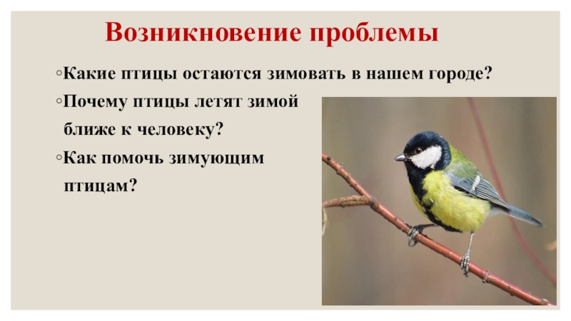 Возникновение проблемыКакие птицы остаются зимовать в нашем городе?Почему птицы летят зимой ближе к человеку?Как помочь зимующим птицам?