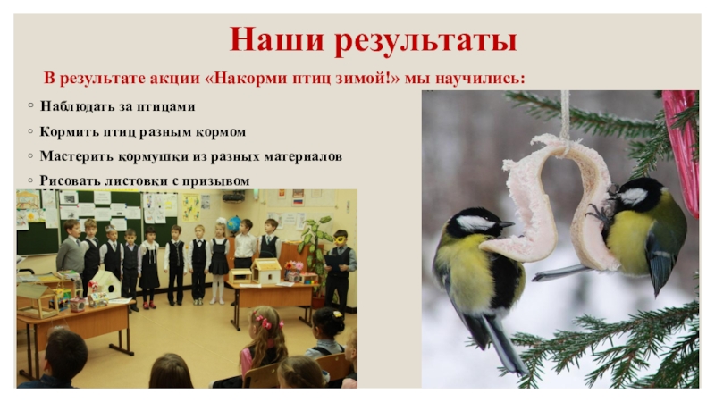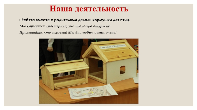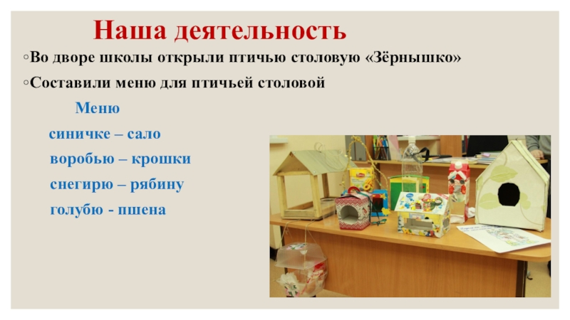 Наша деятельностьВо дворе школы открыли птичью столовую «Зёрнышко»Составили меню для птичьей столовой