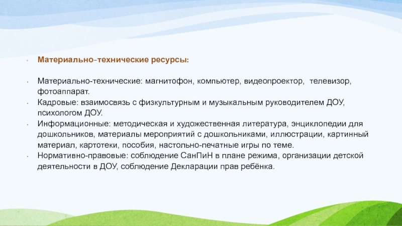 Материально-технические: магнитофон, компьютер, видеопроектор, телевизор, фотоаппарат.
