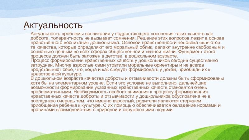 Актуальность проблемы воспитания у подрастающего поколения таких качеств как доброта, толерантность