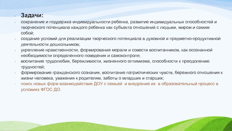 создание условий для реализации творческого потенциала в духовной и предметно-продуктивной деятельности дошкольников;