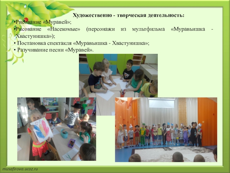 Помощь в организации театрализованного представления «Муравьишка - Хвастунишка»;