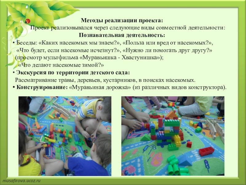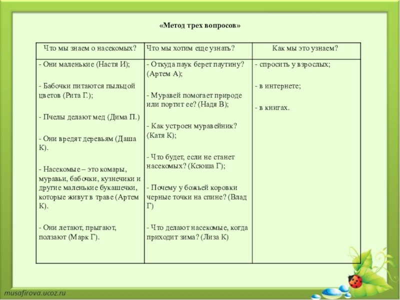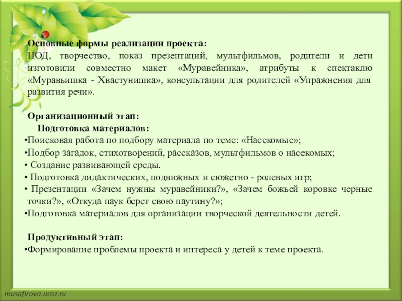 Презентации «Зачем нужны муравейники?», «Зачем божьей коровке черные точки?», «Откуда паук берет свою паутину?»;