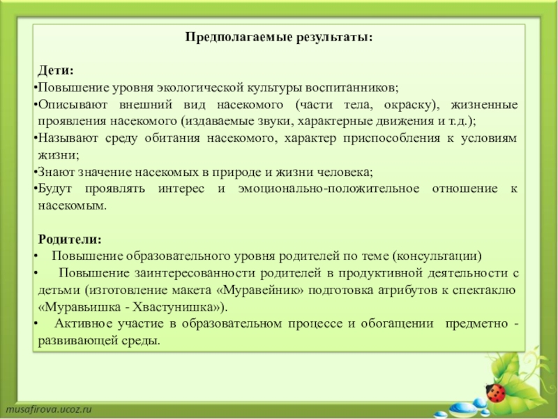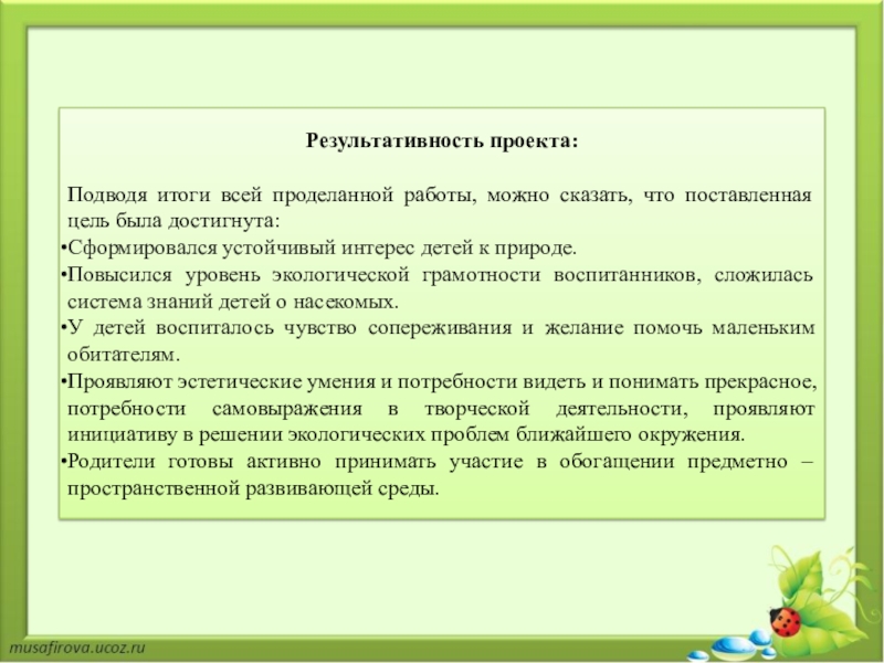 Повысился уровень экологической грамотности воспитанников, сложилась система знаний детей о насекомых.