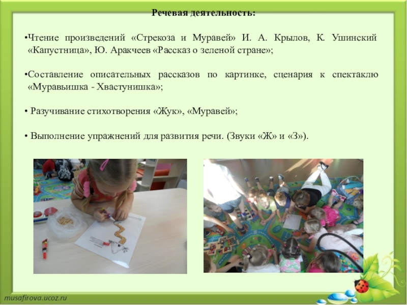 Составление описательных рассказов по картинке, сценария к спектаклю «Муравьишка - Хвастунишка»;
