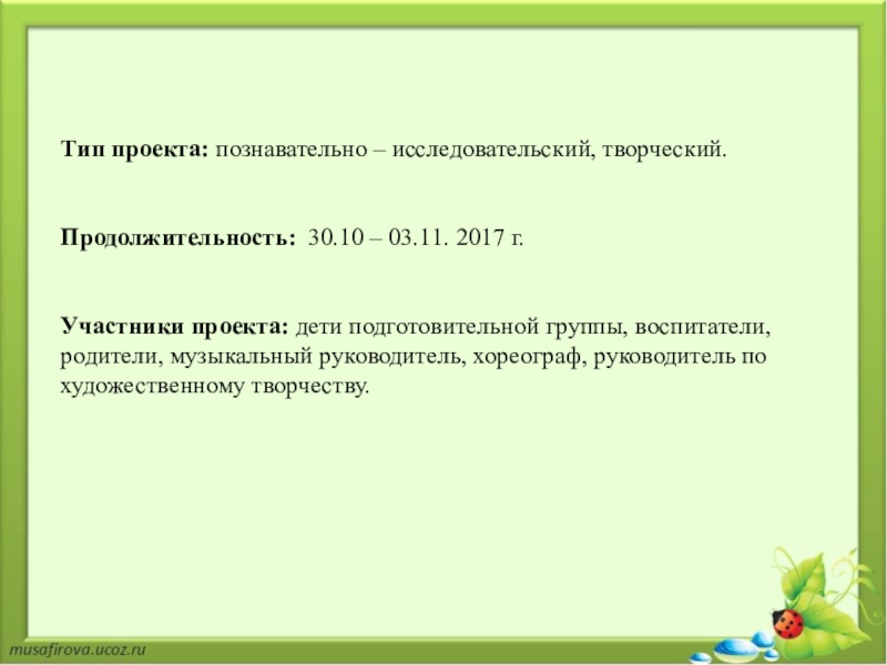 Слайд 2Тип проекта: познавательно – исследовательский, творческий.