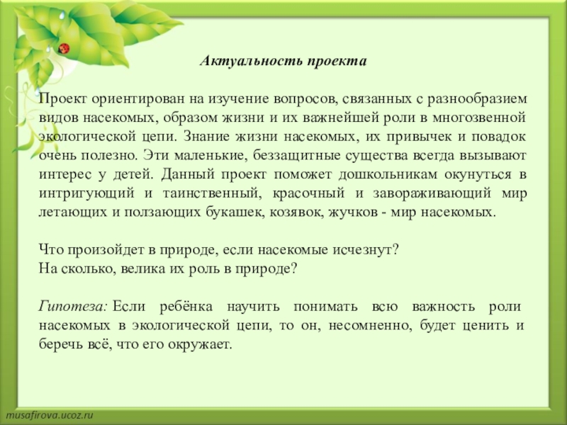 Гипотеза: Если ребёнка научить понимать всю важность роли насекомых в экологической цепи, то он, несомненно, будет ценить и беречь всё, что его окружает.