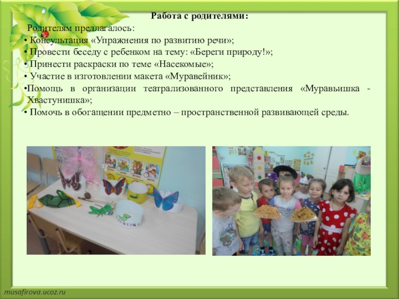 изготовили совместно макет «Муравейника», атрибуты к спектаклю «Муравьишка - Хвастунишка», консультации для родителей «Упражнения для развития речи».