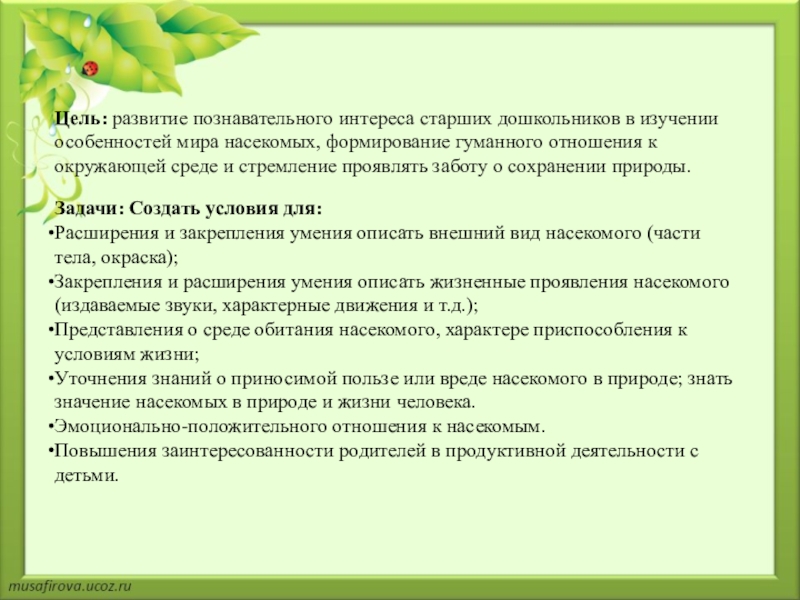 Слайд 3Цель: развитие познавательного интереса старших дошкольников в изучении особенностей мира насекомых,