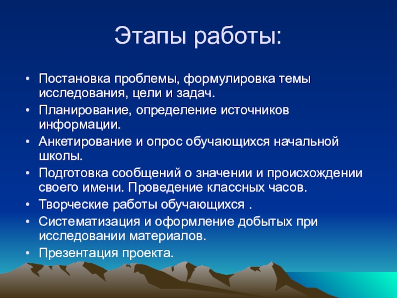 Этапы работы:Постановка проблемы, формулировка темы исследования, цели и задач.Планирование, определение источников информации.Анкетирование и опрос обучающихся начальной школы.Подготовка