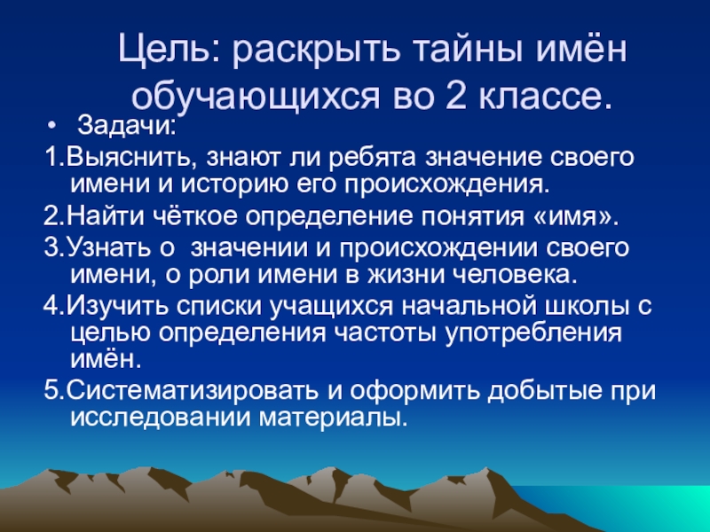 Цель: раскрыть тайны имён обучающихся во 2 классе. Задачи:1.Выяснить, знают ли ребята значение своего имени и историю его происхождения.2.Найти чёткое определение понятия «имя».3.Узнать о значении и происхождении своего имени, о роли имени в жизни человека.4.Изучить списки