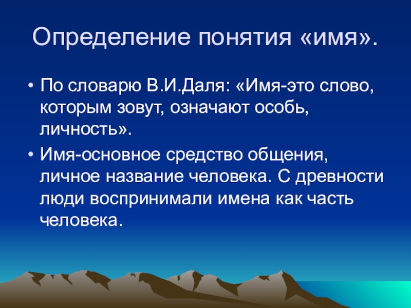 Определение понятия «имя».По словарю В.И.Даля: «Имя-это слово, которым зовут, означают особь, личность».Имя-основное средство общения, личное название человека.