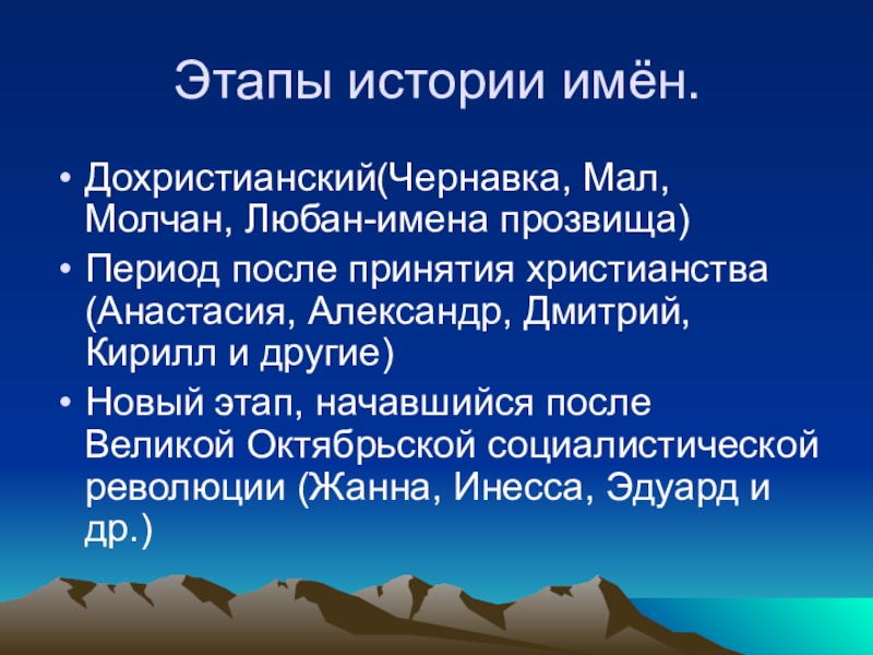 Этапы истории имён.Дохристианский(Чернавка, Мал, Молчан, Любан-имена прозвища)Период после принятия христианства (Анастасия, Александр, Дмитрий, Кирилл и другие)Новый этап,